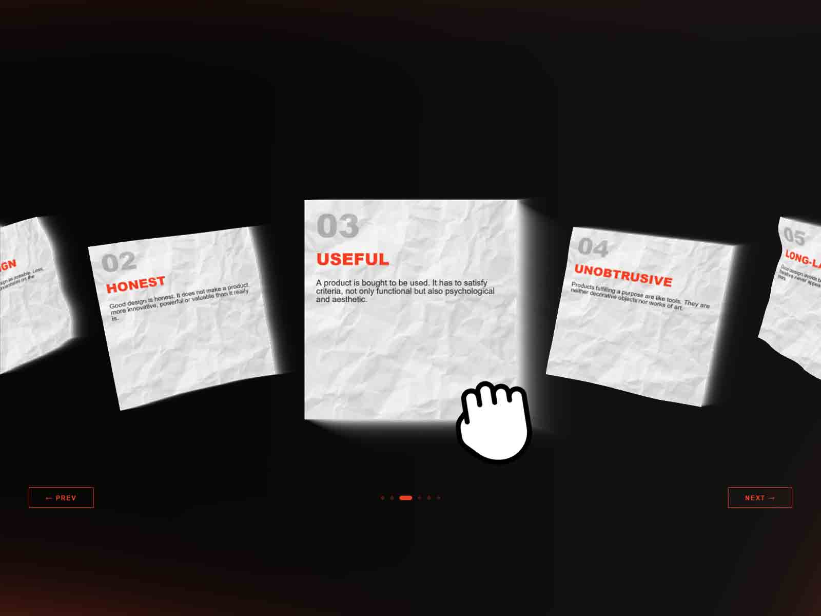 A 3D carousel where cards bend, flex, and drift through space with real physics. Adjustable organic distortion, spring-based momentum, and continuous drag let you tune the feel from subtle depth to full tactile motion. Drop it in and make scrolling physical.